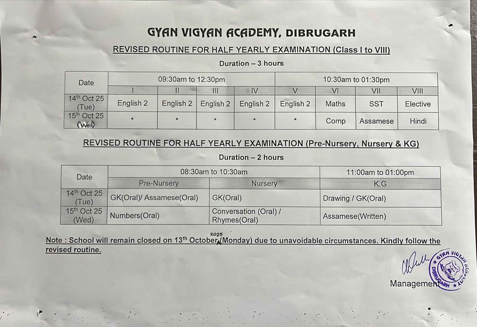 - Revised Half-Yearly Examination Routine.