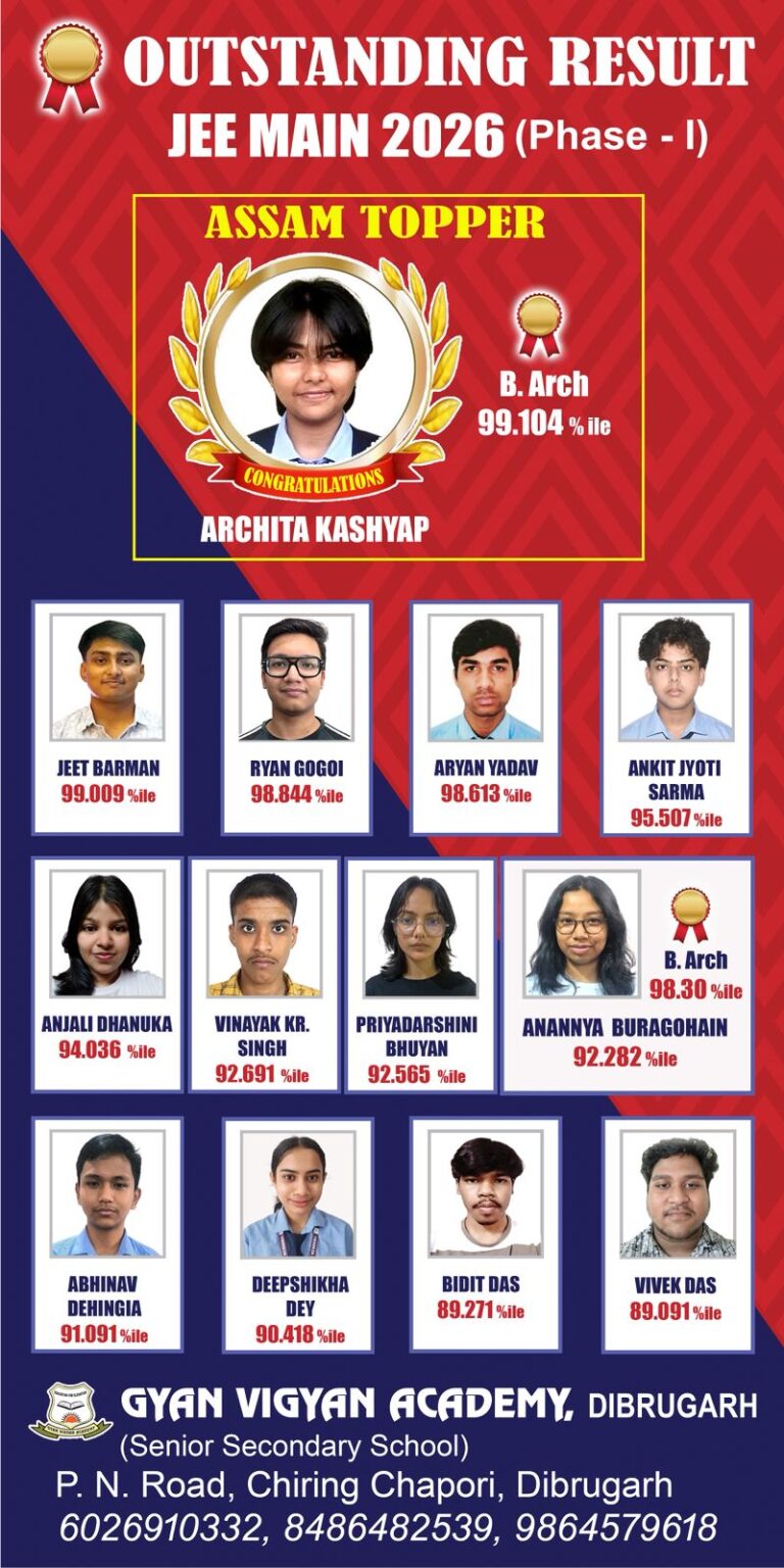 Gyan Vigyan Academy, Dibrugarh proudly celebrates the outstanding performance of its students in JEE Main 2026 (Phase–I), with Archita Kashyap emerging as the Assam Topper in B.Arch with 99.104 percentile, along with several other students securing excellent percentiles above 89%. This remarkable achievement reflects our commitment to quality education, expert faculty guidance, and disciplined preparation, making Gyan Vigyan Academy a trusted name for you child’s bright future.