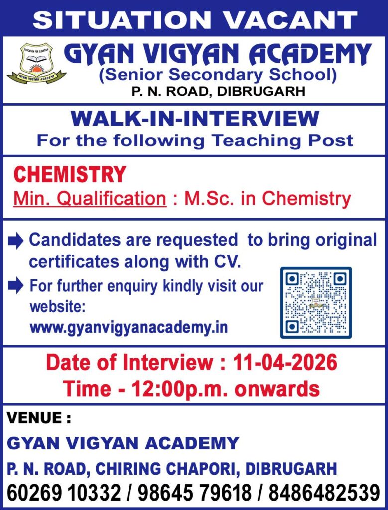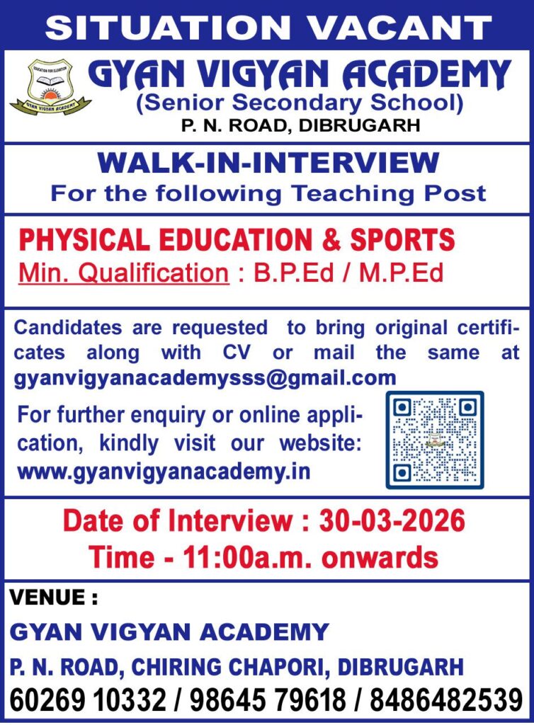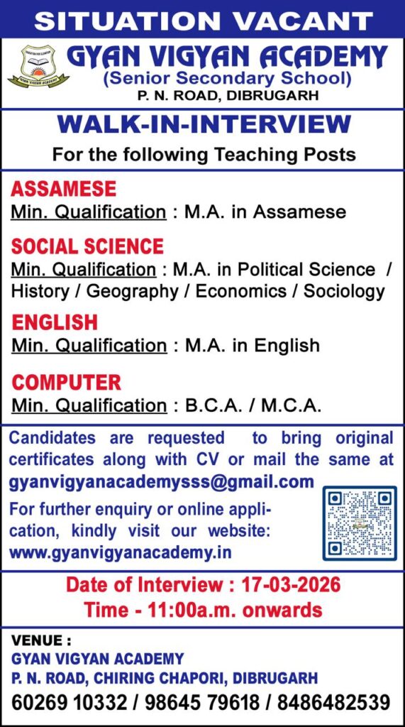 Walk-in interview for the post of Teacher (Subject – Assamese, Physical Education & Sports and Computer Science). Experienced faculty will be given preference. Salary negotiable. Revised Date of interview : 26th September, 2025 (From 12:30 pm onwards).